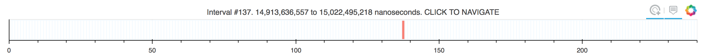 At the very top of the page you see a small navigation bar. The bar tells you where you are in the execution (the red marker). By clicking on other intervals within the bar you can navigate to other intervals. For example, if you wanted to look at the execution interval located after the current one, you will just click on the white bar following the current, red-highlighted, bar.