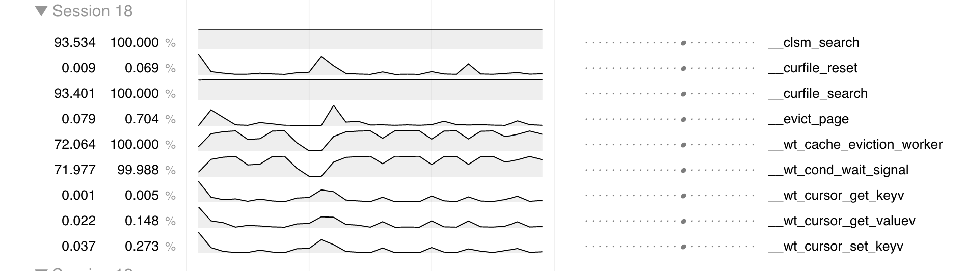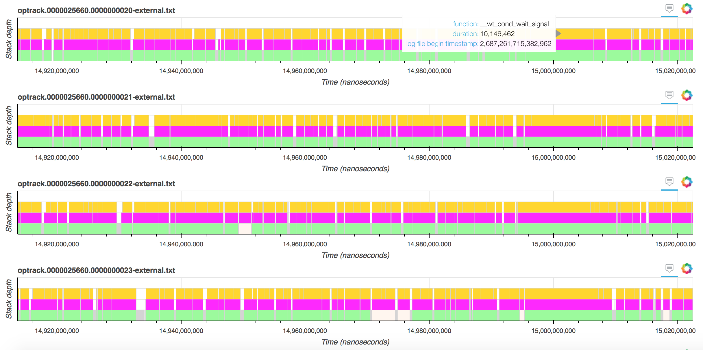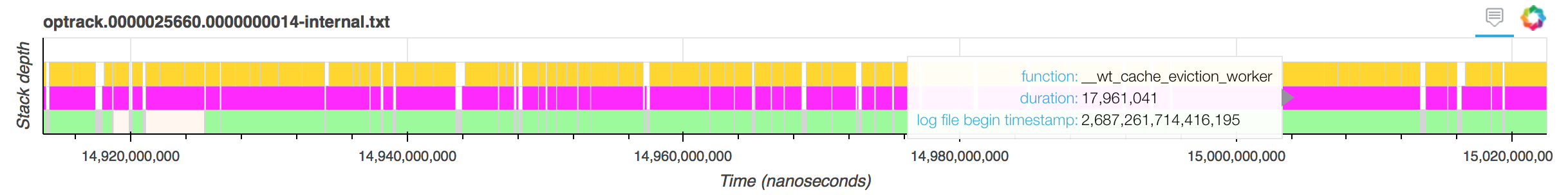 In our example visualization, if we scroll down to the function sequences for external threads, we will quickly see a few instances where __wt_cache_eviction_worker took longer than 15 ms, for example here: