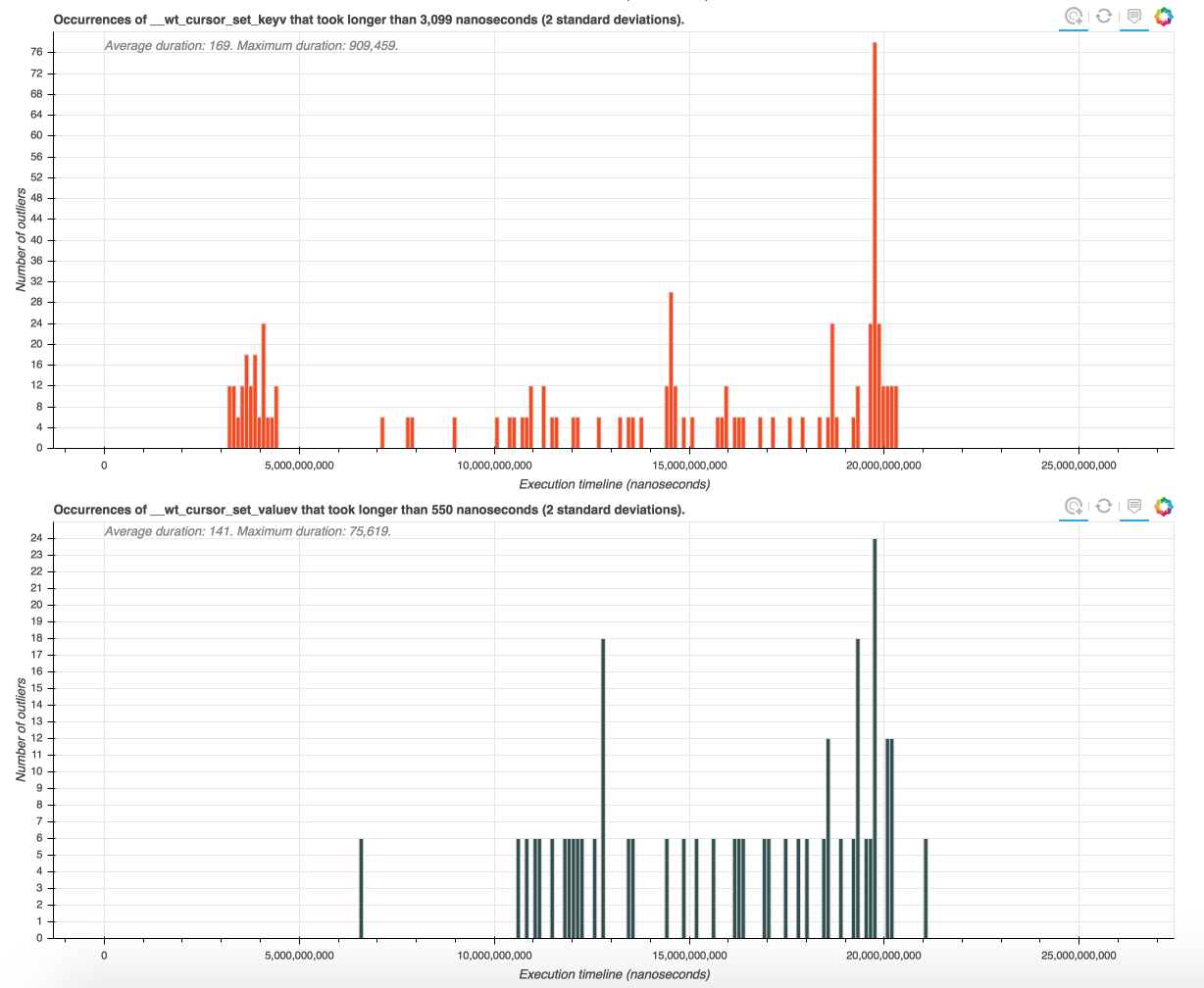 The main page shows a number of outlier histograms. Each histogram corresponds to a function that was tracked by the operation tracking system in WiredTiger. The x-axis shows the execution timeline (in nanoseconds). The y-axis shows how many abnormally long executions of the function occurred during very period of the execution.