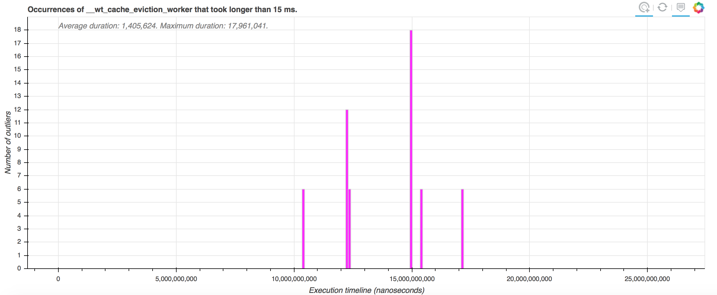 Now you can see the outlier charts complying with the configuration parameters we supplied. For example, on the chart for the __wt_cache_eviction_worker, we see only the intervals where that function took longer than 15 ms to complete.